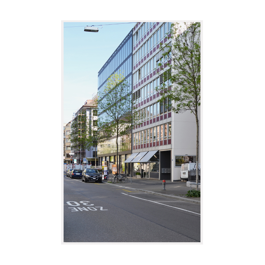 Die Aufgabe sucht nach einer Erfindung – wie sieht die Beautywelt für Männer aus. Der Entwurf beantwortet die Frage mit einer innenräumlichen Verzahnung der progressiv-modernistischen Konstruktion des Bestandsgebäudes und dessen materielle Überschreibung. Die bestehende Stahlkonstruktion, des in den 60er Jahren gebauten Bürohauses wird neu inszeniert und bildet die Basis für einen Wechsel aus Hell- Dunkelkontrasten für das geschaffene Raumkontinuum. Das Bürohaus selber erhält in Ergänzung seiner gerasterten Aluminiumfassade, durch den neu gesetzten Eingang und die öffentliche Funktion eine direkte Anbindung an den Strassenraum und schafft eine Adresse in der Stadt.