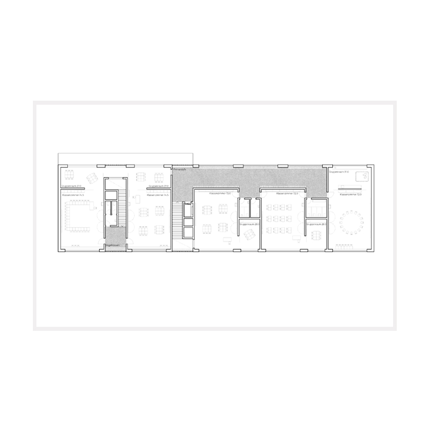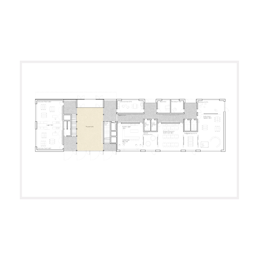 Das Primarschulhaus Stapfenacker wurde 1930-31 durch den Berner Architekten Karl Indermühle erbaut. Sein Sohn Peter Indermühle erweiterte 1947 die Anlage mit einem dritten Klassentrakt. Die Schulanlage ist im Stil des „Neuen Bauens“ gestaltet und gilt als eine der frühsten Schulbauten ihrer Art in der Schweiz und wird als ein „hervorragendes Beispiel der Schweizer Moderne“ gewürdigt. Der Neubau verfolgt die Idee, die bestehen- de Schulanlage mit ihren pädagogischen und gestalterischen Qualitäten konsequent weiterzudenken. Er findet als lang gestreckter, zweigeschossiger Baukörper im südwestlichen Teil seinen Platz und nimmt die Höhe des Bestandsbaus auf. Die präzise Einmessung reagiert auf Fluchten vom Bestand und ergänzt die Gesamtanlage zu einem U-förmigen Hof. Die Haupträume der Tagesschule entwickeln sich als flexibel schaltbare Raumfolge entlang der Südfassade. Die Basisstufe im Obergeschoss ist über ihre separate Treppe erschlossen, wodurch ein direkter Zugang in den rückwärtigen Grünraum und ein eigener Eingang ermöglicht wird.